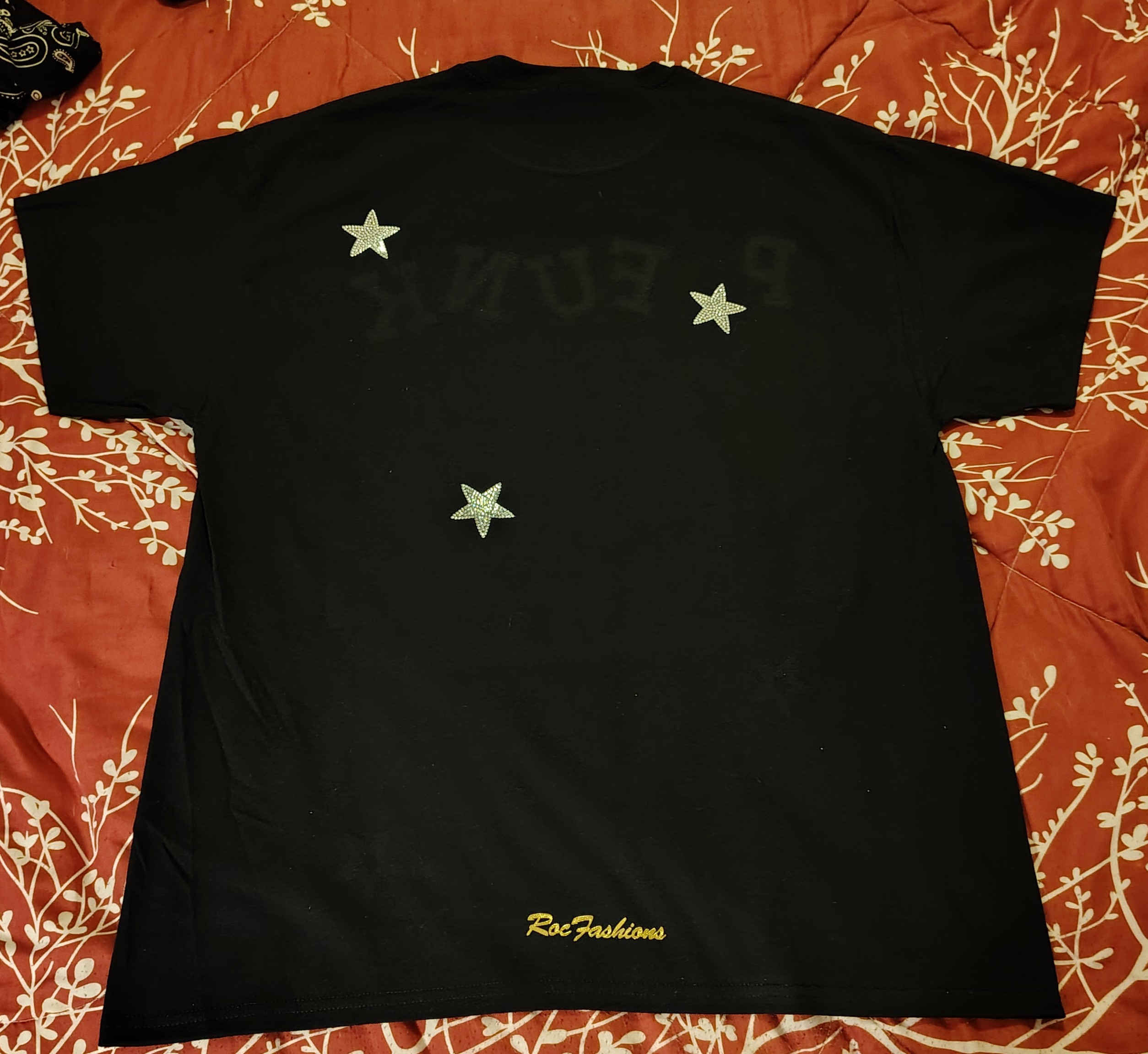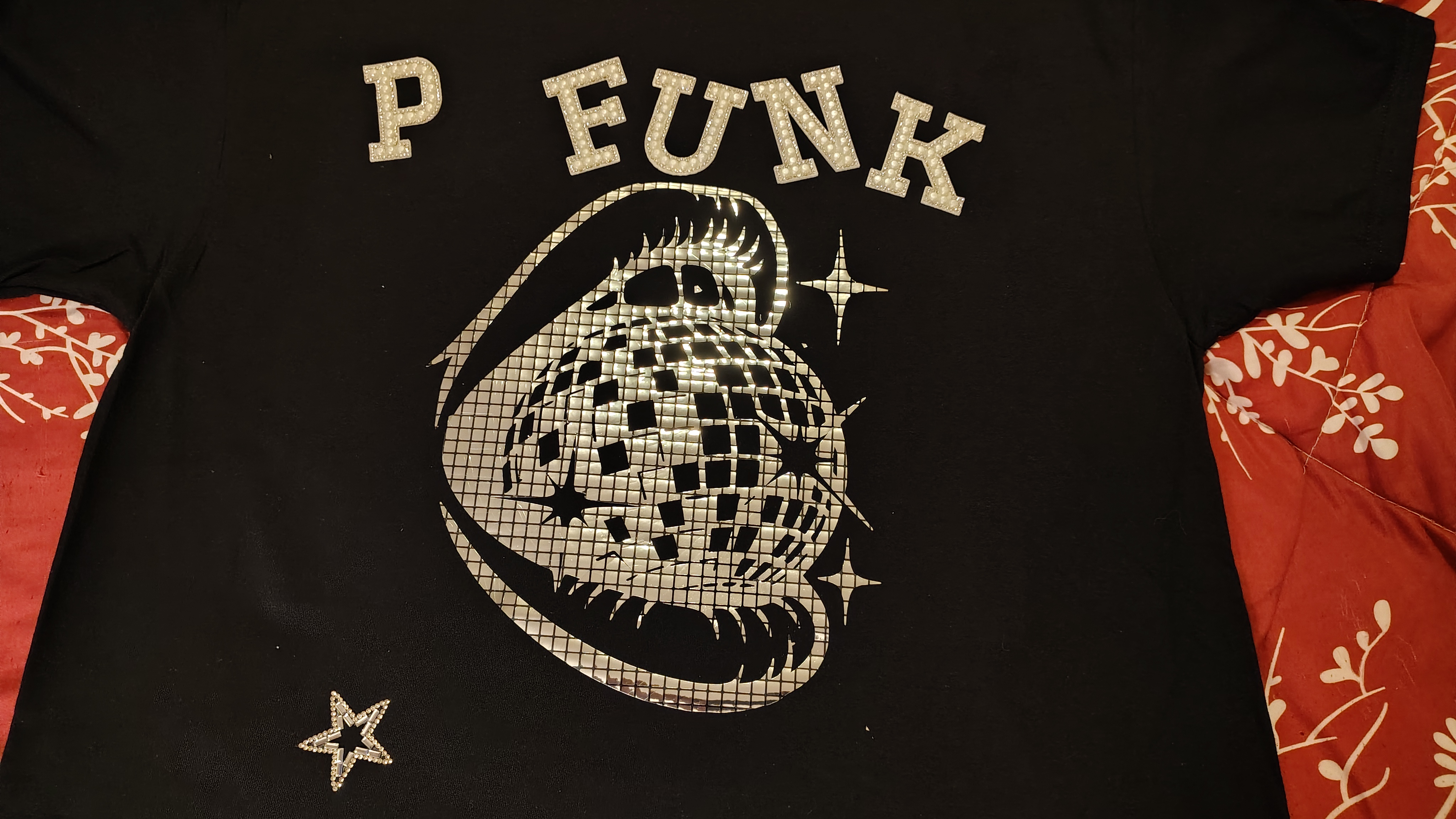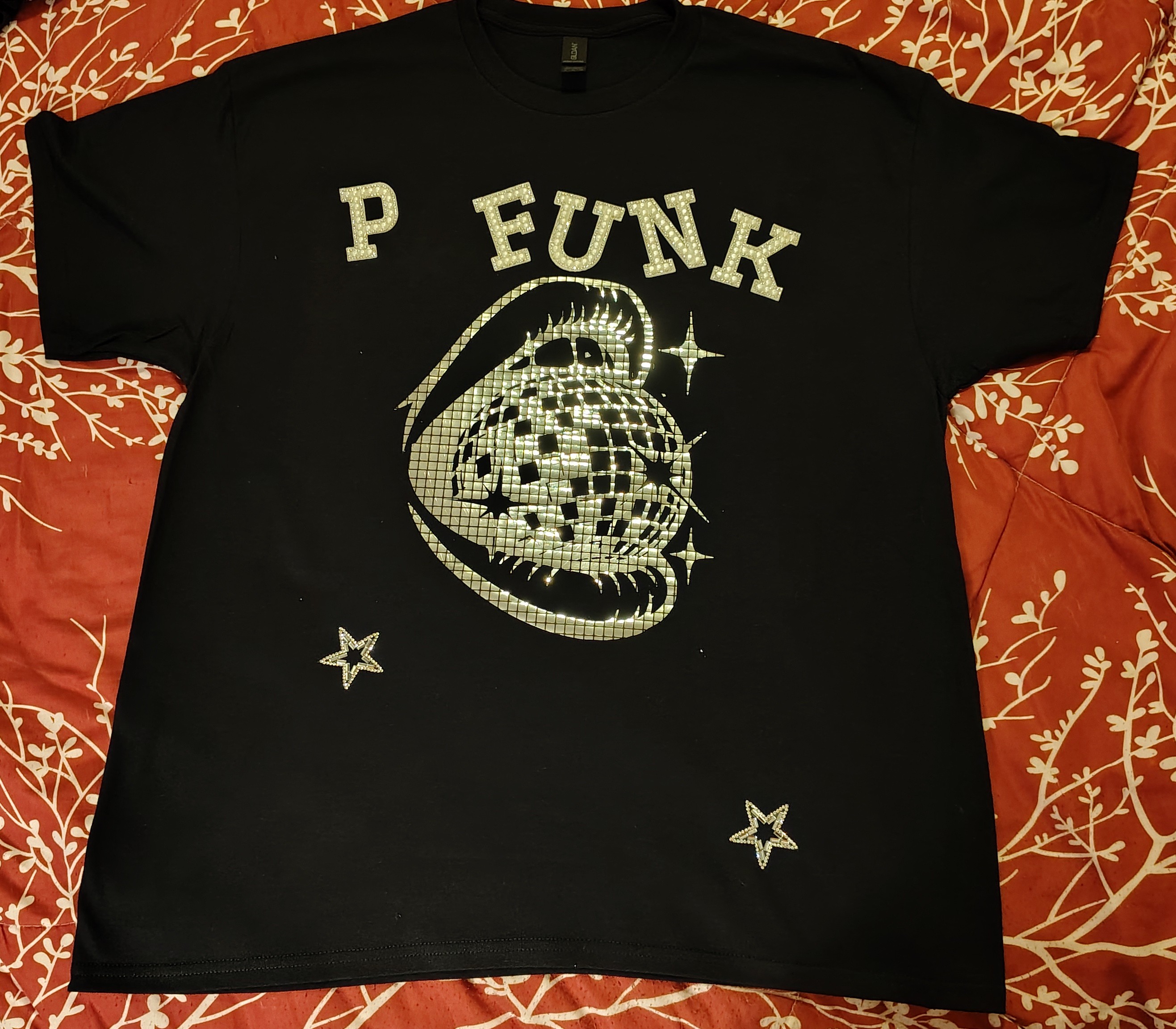 Simply "P Funk" Unisex Shirts Custom Made, With lips and ball in shiny silver or gold, The words "P Funk" in raised letters.